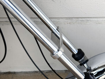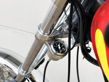 〇走行性能や疲れにくさの補正のためだけでなく、フロントホイールが前方を伸びよりチョッパースタイルを助長するアルミ削り出しステム。ホイール位置のオフセット(トレール幅の短縮)によりロングフォークにありがちな重たいハンドリングを大きく軽減しています。