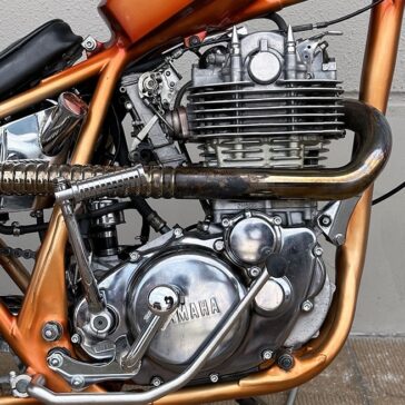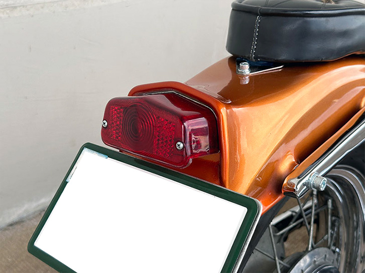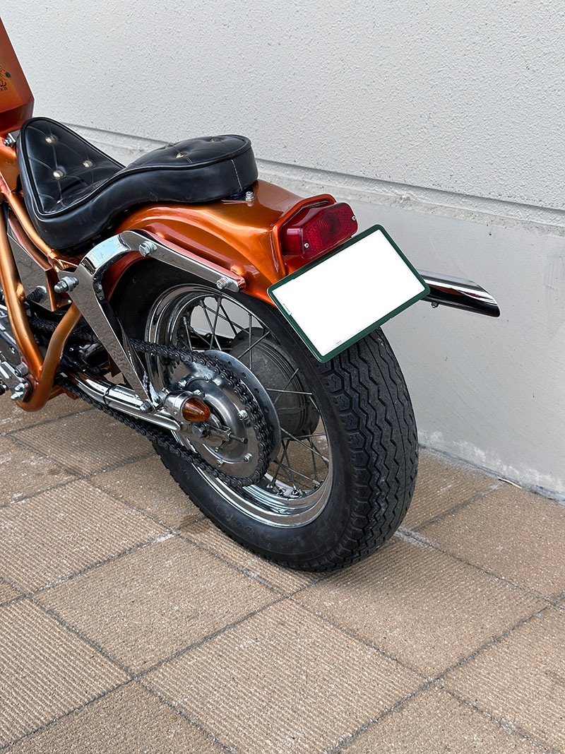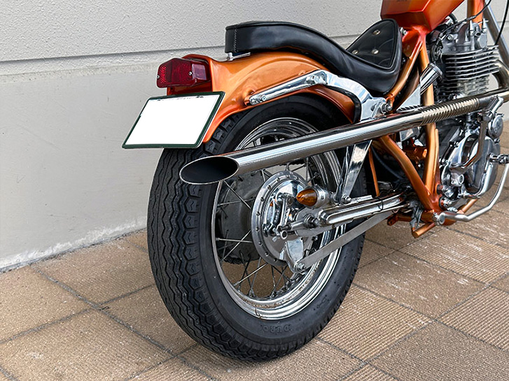 ●フラットフェンダーをベースに板金を足して制作したリアフェンダーはリジットストラットでマウント。延長したサイドにモールをいれたスイングアームや16インチ化などで車体のバランスを整えています。