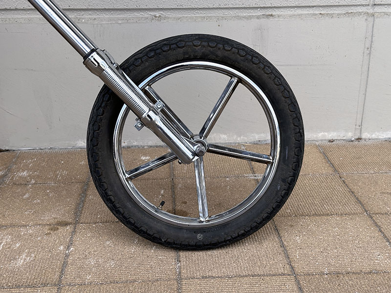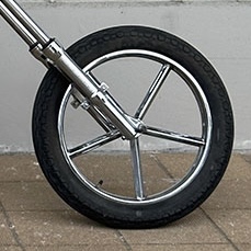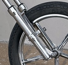 〇トレール量確保のためアクスル位置がオフセットされたボトムケースを流用。旋盤でリップル加工しクロームメッキで仕上げています。