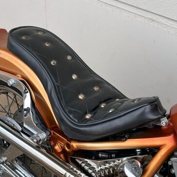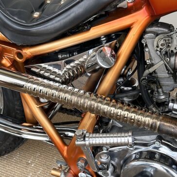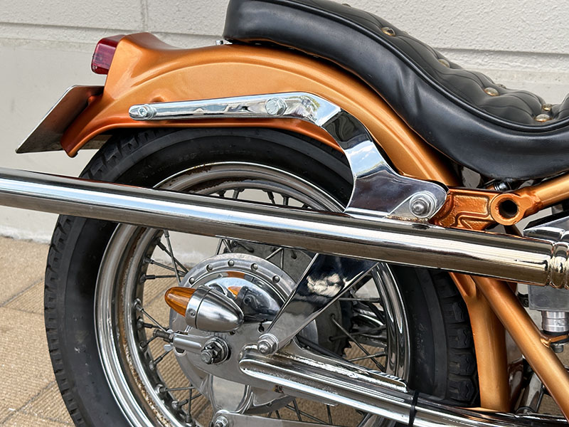 リアフェンダーを支えるワンオフ制作のブーメランストラットなど当時のチョッパー制作の