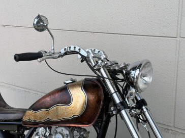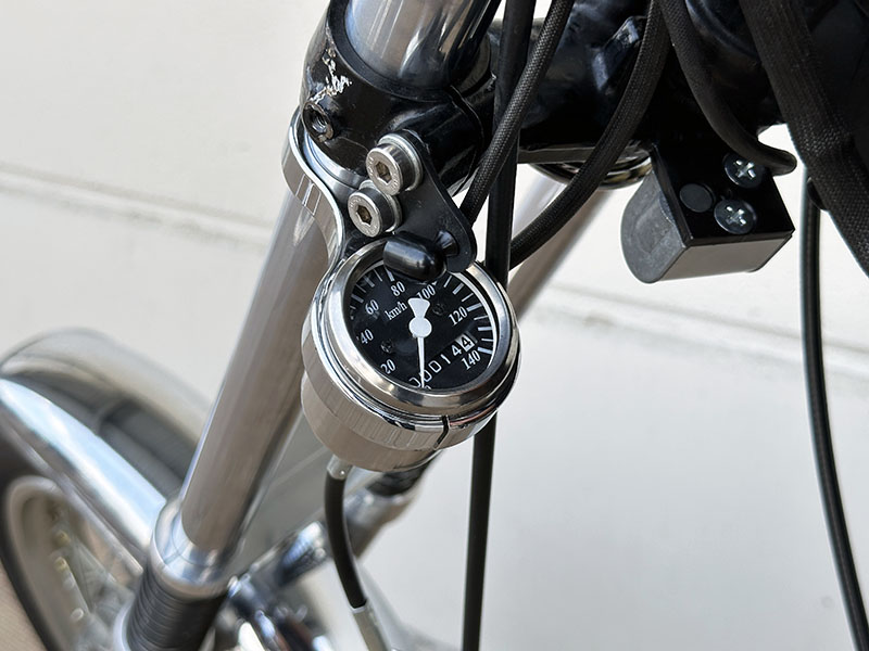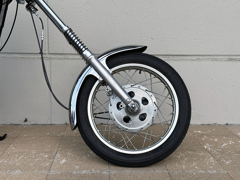 ●合計35cm延長したフロントフォークやビンテージAEEレプリカの変形Zバーハンドル、定番のハンドル周りスッキリ処理で仕上げたフロント周り。