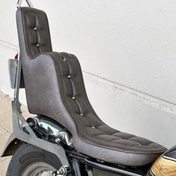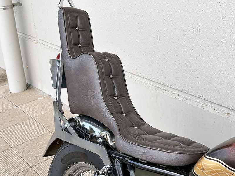●大柄オーナーさまに跨ってもらいながらラクな位置として決定したフォワードステップキットに、ワンオフ製作の背もたれつきハイバックシートをワンオフ製作。