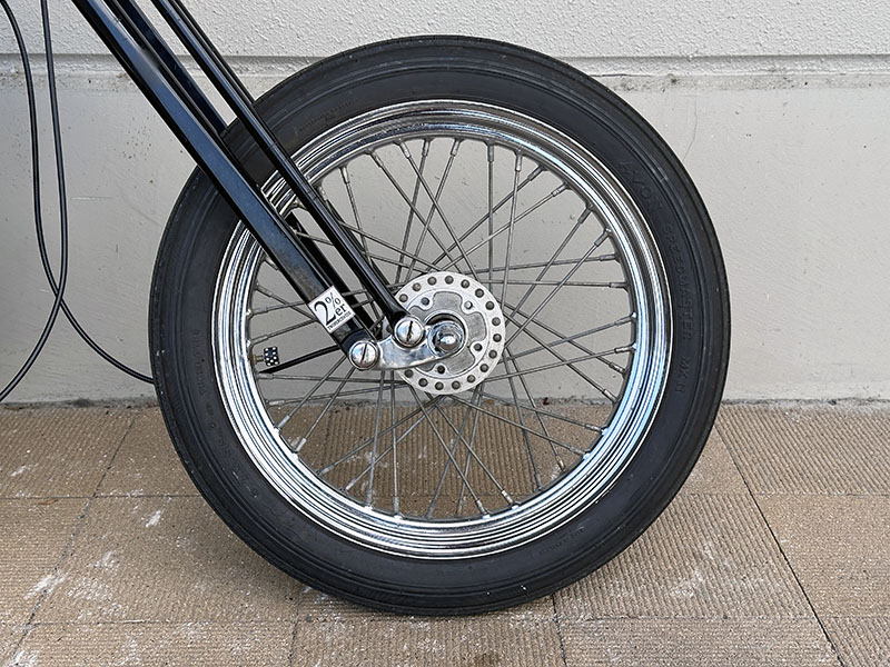 ●6インチオーオーバーのハーレー用DNAスプリンガーに通称ナローハブ(こちらもハーレー用)19インチを加工流用したフロントエンド。