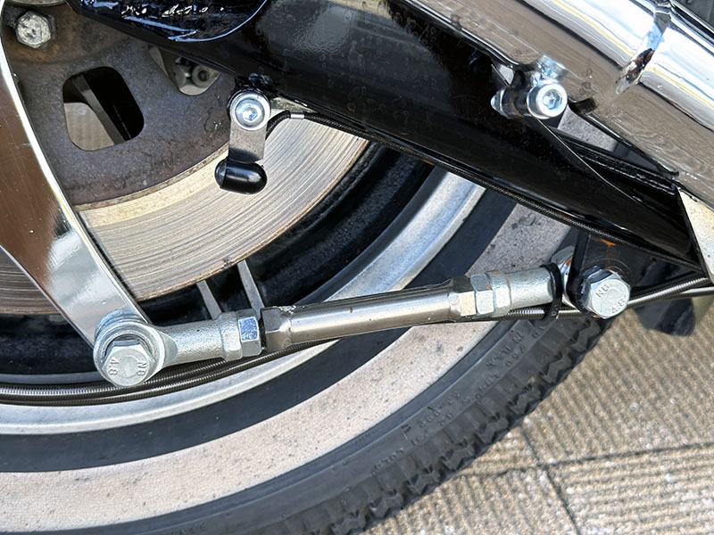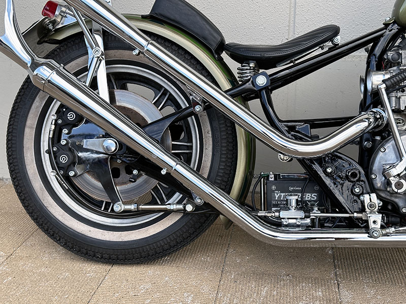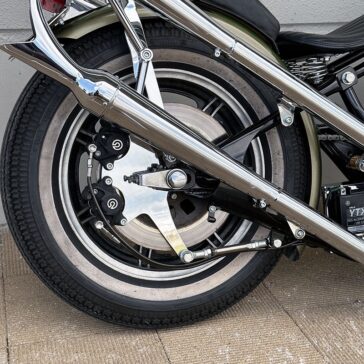 リアホイールにブレーキキャリパーを2基掛けすることで、チョッパーらしいフロントノーブレーキの見た目ながら、