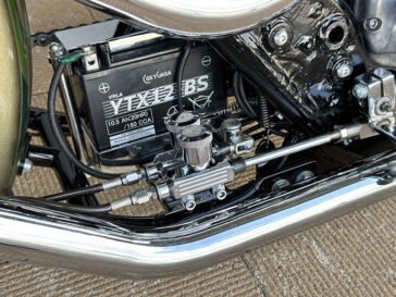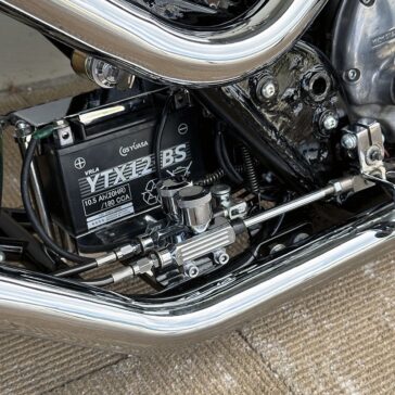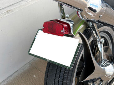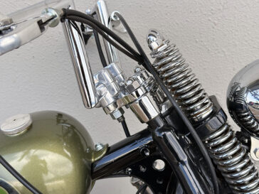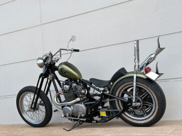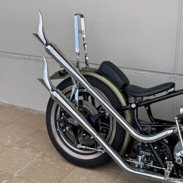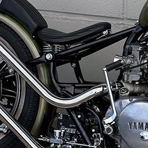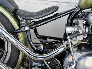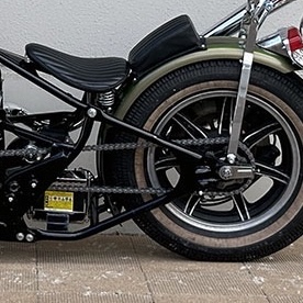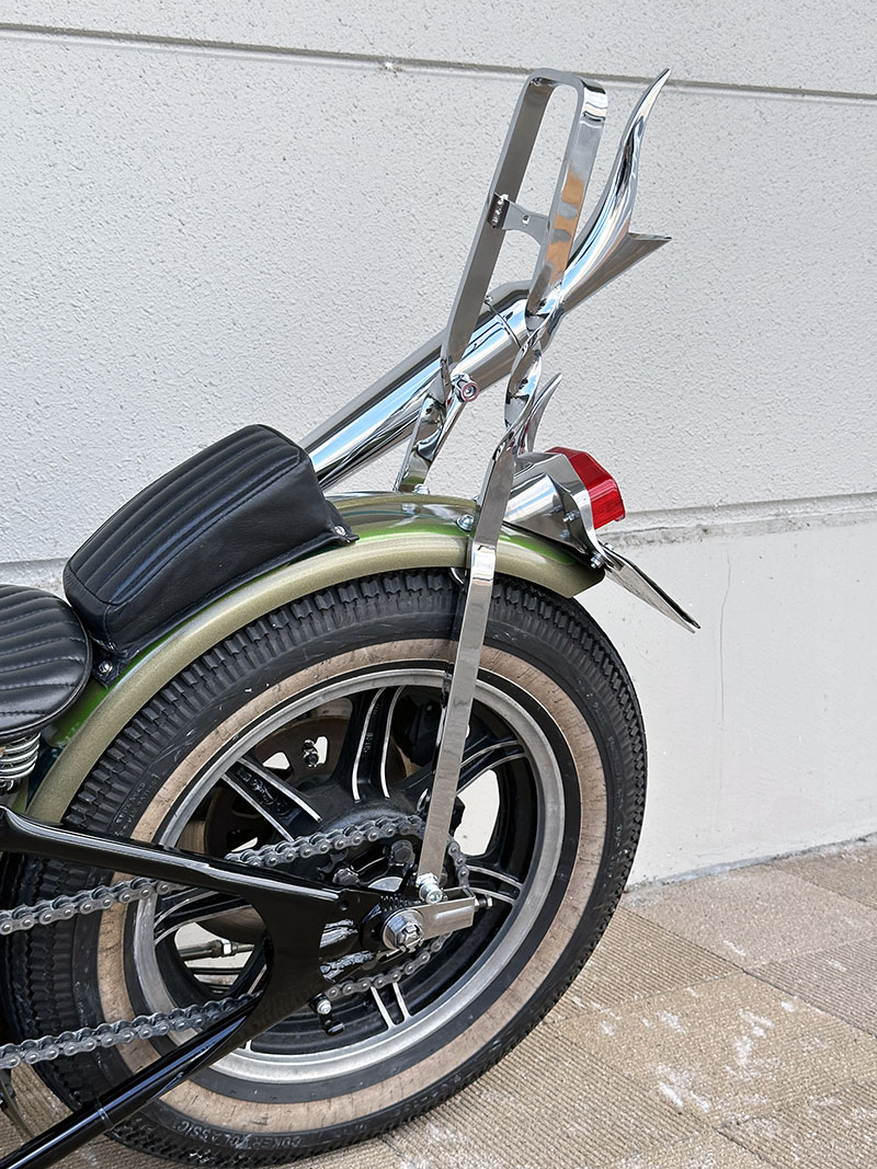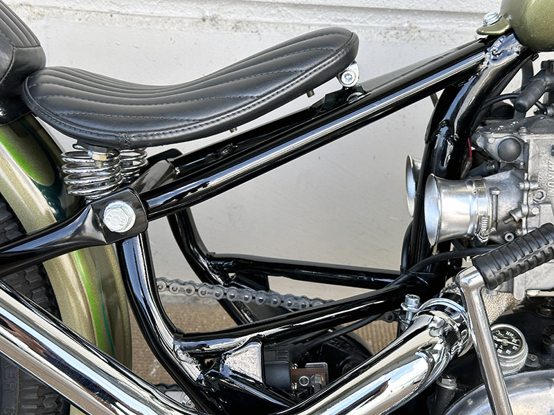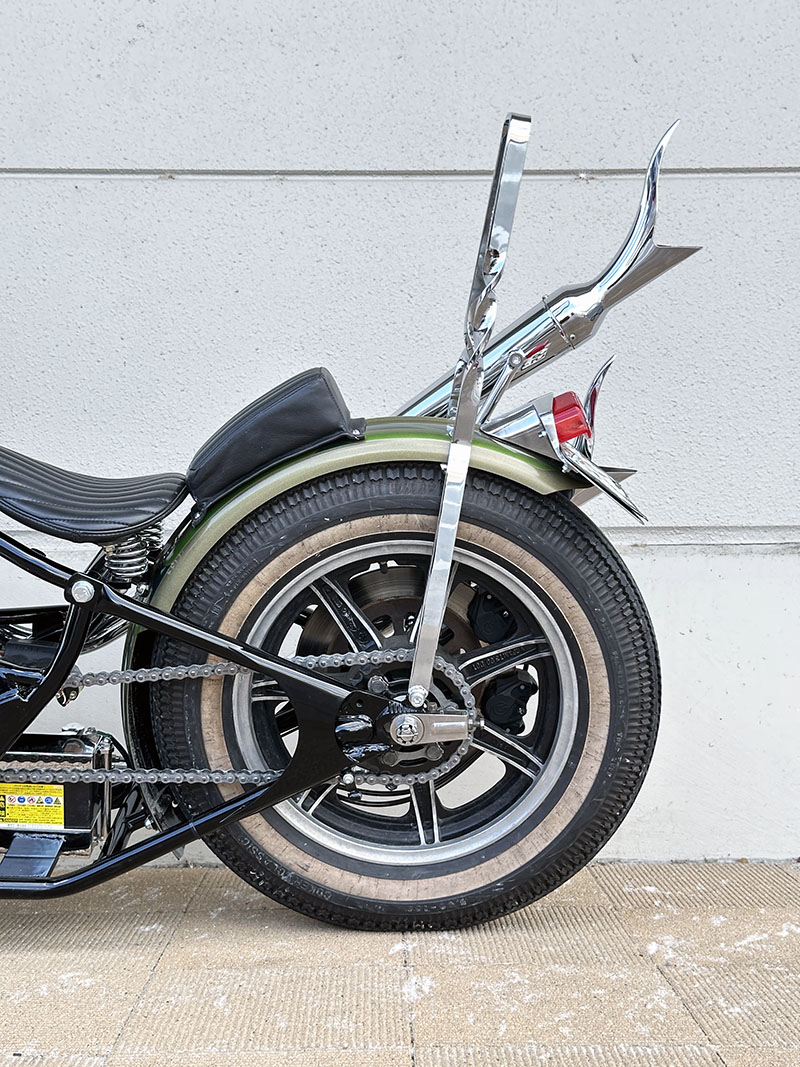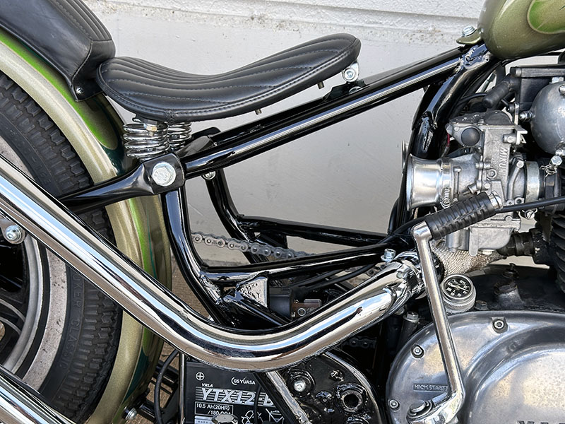 後の車検、スタイルチェンジを考慮したボルトオンハードテール構造で、大柄オーナーの体格に合わせて11cmホイールベースを延長したフレームに、