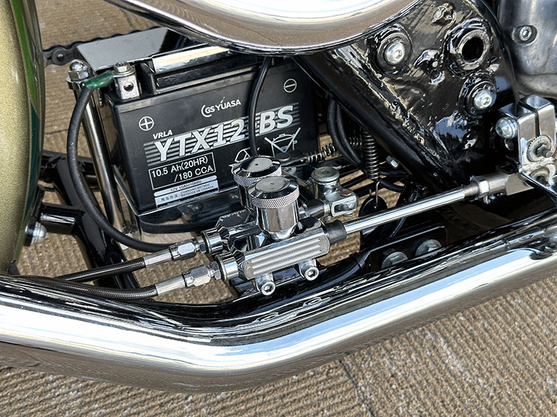 〇ハーレー用のカスタムマスターをハンド、フット用に2連で装着です。片側のマスターはハンドレバーからのワイヤー引き、もう片側のキャリパーはフットブレーキペダルとリンケージで連結しています。